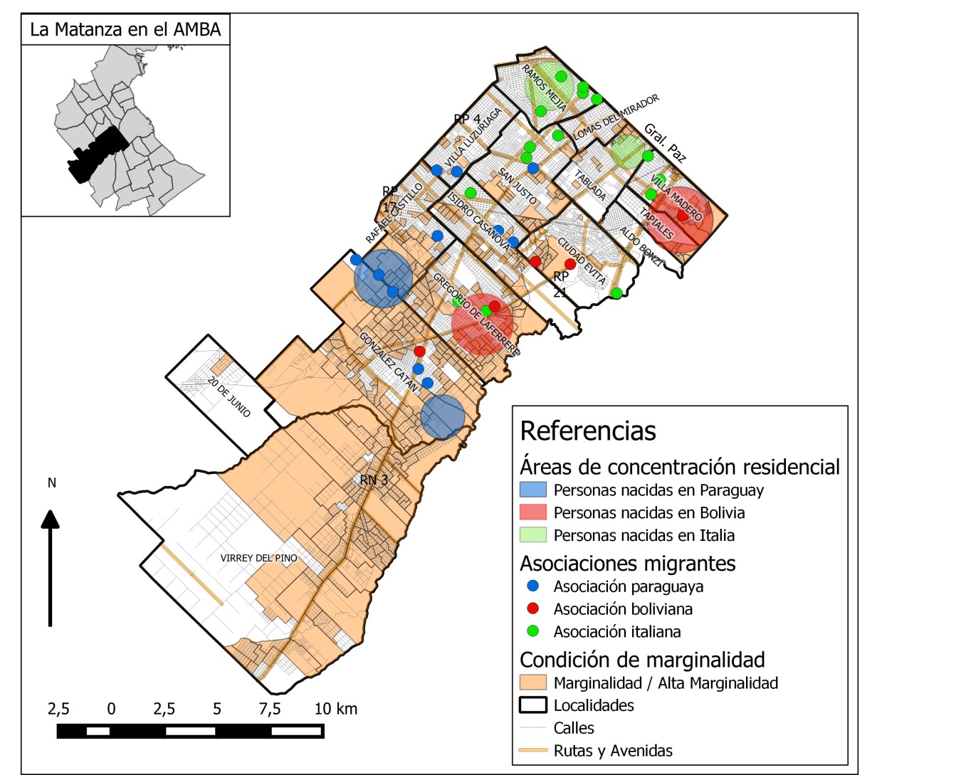 En términos metodológicos, en este capítulo se dará especial énfasis a las técnicas cualitativas, en particular a las entrevistas en profundidad tanto a personas migrantes vecinos/as del área como a referentes de asociaciones vinculadas a las distintas colectividades de La Matanza realizadas entre 2018 y 2022. Además se analizaron también fuentes secundarias. Asimismo, para profundizar en torno a las fronteras urbanas, se utilizaron técnicas cuantitativas, especialmente de análisis espacial, con el procesamiento de estadísticas, censos y otras fuentes, volcadas en un Sistema de Información Geográfica (SIG). Estas permiten visualizar simultáneamente áreas de mayor concentración residencial de los principales grupos migrantes (con datos obtenidos a nivel de radio censal para el 2010), junto con la localización de asociaciones relevadas en trabajos anteriores (Matossian y Melella, 2022). Además, esta representación cartográfica de la incorporación migrante a esta porción de la metrópolis se superpone con otras variables socioterritoriales de importancia para el análisis como son las condiciones de marginalidad propuestas por De Grande y Salvia (2019). A pesar de las limitaciones de las fuentes censales para este tipo de estudios (Marcos y Mera, 2009), estas constituyen la fuente principal para trabajar con altos niveles de desagregación geográfica, de manera de poder captar heterogeneidades en el interior del espacio urbano, en particular para el caso de un municipio como La Matanza, con una superficie de más de 300 km².