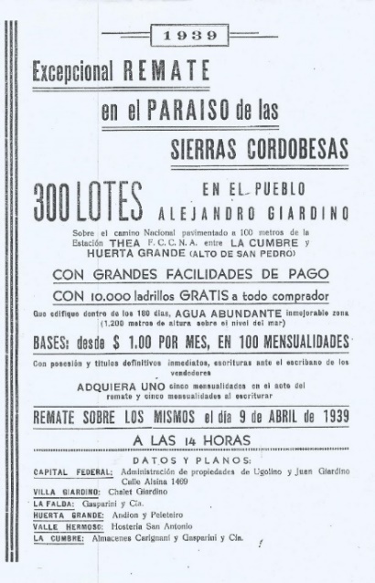 El matrimonio adquirió la estancia “Alto de San Pedro”, que fue rematada judicialmente, (Giono de Micono, 2007, p. 29) y el 9 de abril de 1939 –domingo de Pascuas– se efectuó el primer remate de lotes (Camarca, 2009, p. 14; Giono de Micono, 2007, p. 32; Loyola y Rosales, 2005, p. 18). En el anuncio que reproduce la Figura 5 se destacaban los beneficios que se otorgarían a los adquirientes: facilidades de pago y diez mil ladrillos gratis para los compradores que se comprometieran a edificar dentro del plazo de seis meses. Al respecto, son de destacar tres cuestiones. Por un lado, que este procedimiento de ayuda para la construcción no se limitó al caso del pueblo Alejandro Giardino, como fue bautizado en honor al padre de Ugolino y Juan. Según el testimonio de su sobrino-nieto Osvaldo, la misma modalidad fue habitual en el vínculo entre patrones y obreros en la fábrica de Villa Caraza, por ejemplo (O. Giardino, 21/01/2019). Por otra parte, la urgencia por edificar fue hecha propia por la familia vinculada a la industria textil. De hecho, entre los sitios indicados para la consulta sobre el loteo figura el denominado “Chalet Giardino” de la villa veraniega. Conocido como “Villa Juanita”, en la actualidad es habitado por descendientes de la familia Micono. Finalmente, existen testimonios de la activa promoción que la familia realizó sobre las ventajas del pueblo, incluidos viajes a su cargo, para promover la venta de lotes, algunos de los cuales fueron luego donados por sus propietarios para diversos emprendimientos vinculados a la comunidad (Loyola y Rosales, 2005, p. 47; Roque Rosales, 26 de mayo de 2019).