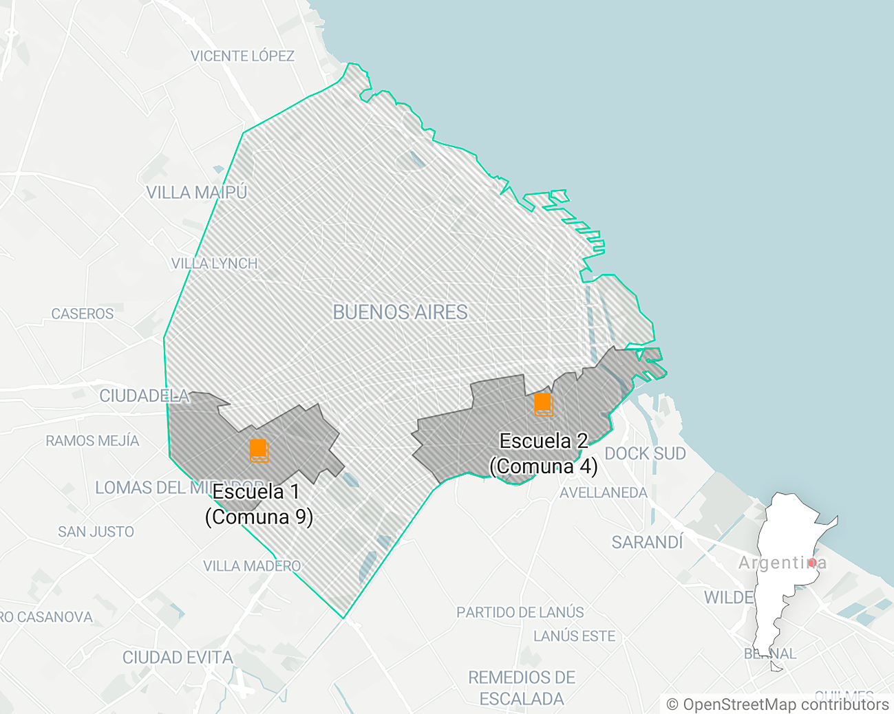 El trabajo de campo se desarrolló en dos momentos entre los meses de septiembre y diciembre de 2022 y 2023[1]. En función de los objetivos del proyecto se seleccionaron cursos del último año de dos escuelas secundarias de gestión estatal. La primera (Escuela 1) con orientación en Ciencias Sociales y en Ciencias Naturales. La segunda (Escuela 2), en Economía y Administración y en Turismo. Ambas situadas en las Comunas 4 y 9, al sur de la CABA (Figura 1). Área que, de acuerdo con distintos indicadores sociales, económicos y urbanísticos, presenta altos niveles de población en situación de vulnerabilidad social (Abelenda, Canevari y Montes, 2016).