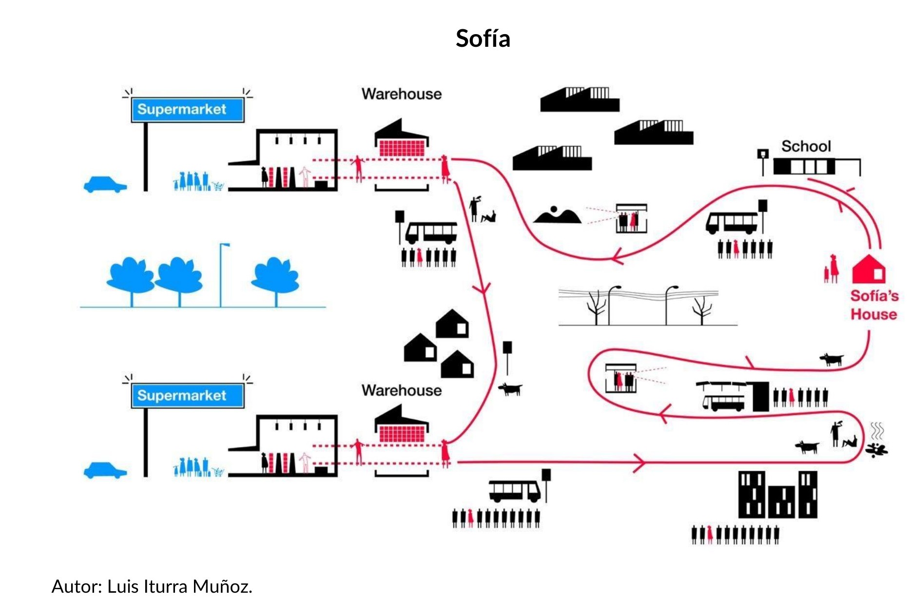 En la ciudad existe una serie de prácticas que sustentan la formalidad que se presenta como una ciudad segura, estable, limpia; una especie de trastienda, en la cual las personas van asumiendo un rol de soporte para grandes empresas de distinto tipo, supermercados, bancos, servicios, etc. Tal como si estuviéramos hablando de una obra de teatro donde los actores cambian sus ropajes para interpretar un papel a una audiencia, en la ciudad ocurre una situación similar, hay una tras bambalinas que sustenta lo que parece ordenado y estable, y es esta la metáfora que nos sirvió para comentar esta historia. Sofía es una reponedora en dos supermercados. Su experiencia de movilidad, en la cual debe dejar su hijo al colegio antes de ir al trabajo, caminar por lugares desolados, oscuros, disfrutar el mirar la cordillera en el viaje en metro, o llegar a la bodega en la cual debe ponerse el uniforme, contrasta con el orden aparente en el cual esos supermercados se presentan. En este sentido, Sofía va soportando toda la informalidad, el gasto de tiempo, las preocupaciones y las dificultades, para mantener la ciudad funcionando. Una actividad que millones de personas realizan en las ciudades cada día. El diagrama así nos muestra cómo la vida de Sofía se desarrolla ahí tras bambalinas de los supermercados, pasando por diferentes espacios urbanos y situaciones, algunas placenteras, como mirar por la ventana del metro, y muchas otras que para ella van en desmedro de su calidad de vida, como aglomeraciones, malos espacios urbanos, precariedad e inseguridad.
