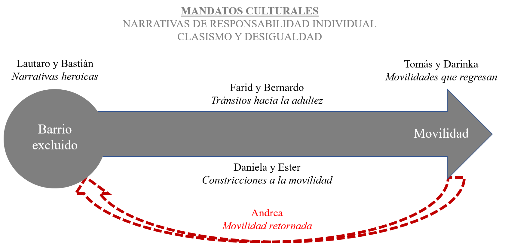 Pero, al mismo tiempo, algunos y algunas jóvenes quieren rebelarse ante esta realidad de tener que salir del barrio y buscan reivindicar su valor y confrontar las expectativas de movilidad socioespacial, como es el caso de Bastián, mientras que otros y otras desarrollan cabalmente una trayectoria de movilidad social que parece persistentemente confrontada con la experiencia negativa de haber tenido que salir del barrio, como son los casos de Darinka y Andrea.