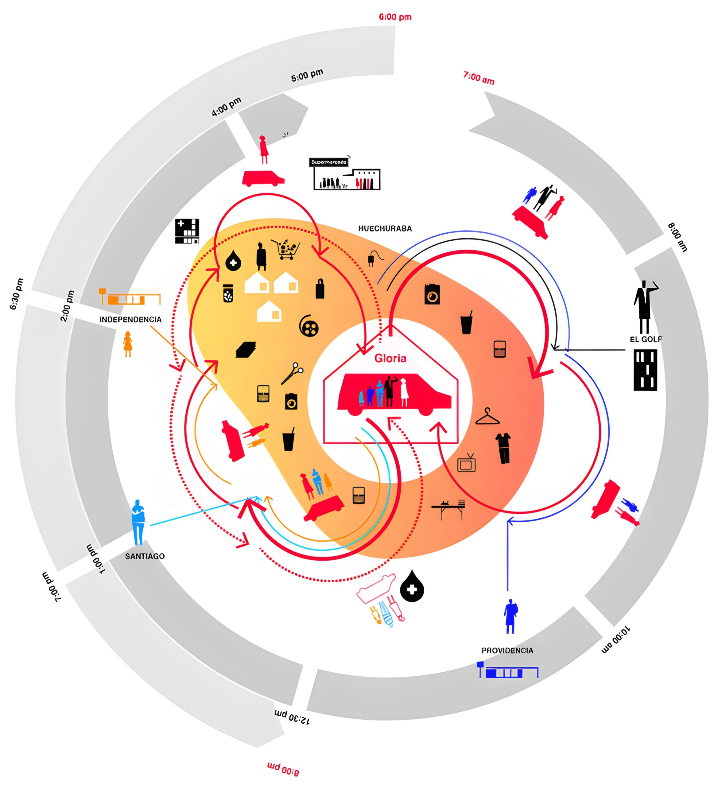 Gloria tiene tres hijos junto a su esposo, y es ella quien está encargada de conducir el auto familiar y transportar a cada uno de los integrantes de su familia por la ciudad en sus actividades. Ella va conduciendo por varias esferas de su vida pública y privada, y compartiendo esos espacios con su familia. Para comunicar esta idea, pensamos en una imagen muy sencilla, en la idea de una flor, en la cual cada una de las esferas de movimiento es como cada uno de sus pétalos. Esta representación, una de las tantas metáforas que pudiesen construirse con esta información, busca lograr comprender que el viaje de Gloria es el ir atravesando esas esferas, las cuales son una parte fundamental de su experiencia de vivir la ciudad. Así, dejar a sus hijos al colegio, volver a su casa, dejar luego a su esposo, volver, hacer las compras, y después ir adonde sus padres nos habla de cómo Gloria va transitando por esos pétalos, esas esferas durante diferentes horas del día, y está en constante movimiento. En el caso del diagrama, se puede observar los horarios como un círculo que enmarca esta flor en la que Gloria realiza sus actividades cotidianas. Un ida y vuelta que va desde las 7 a. m. hasta las 8 p. m.