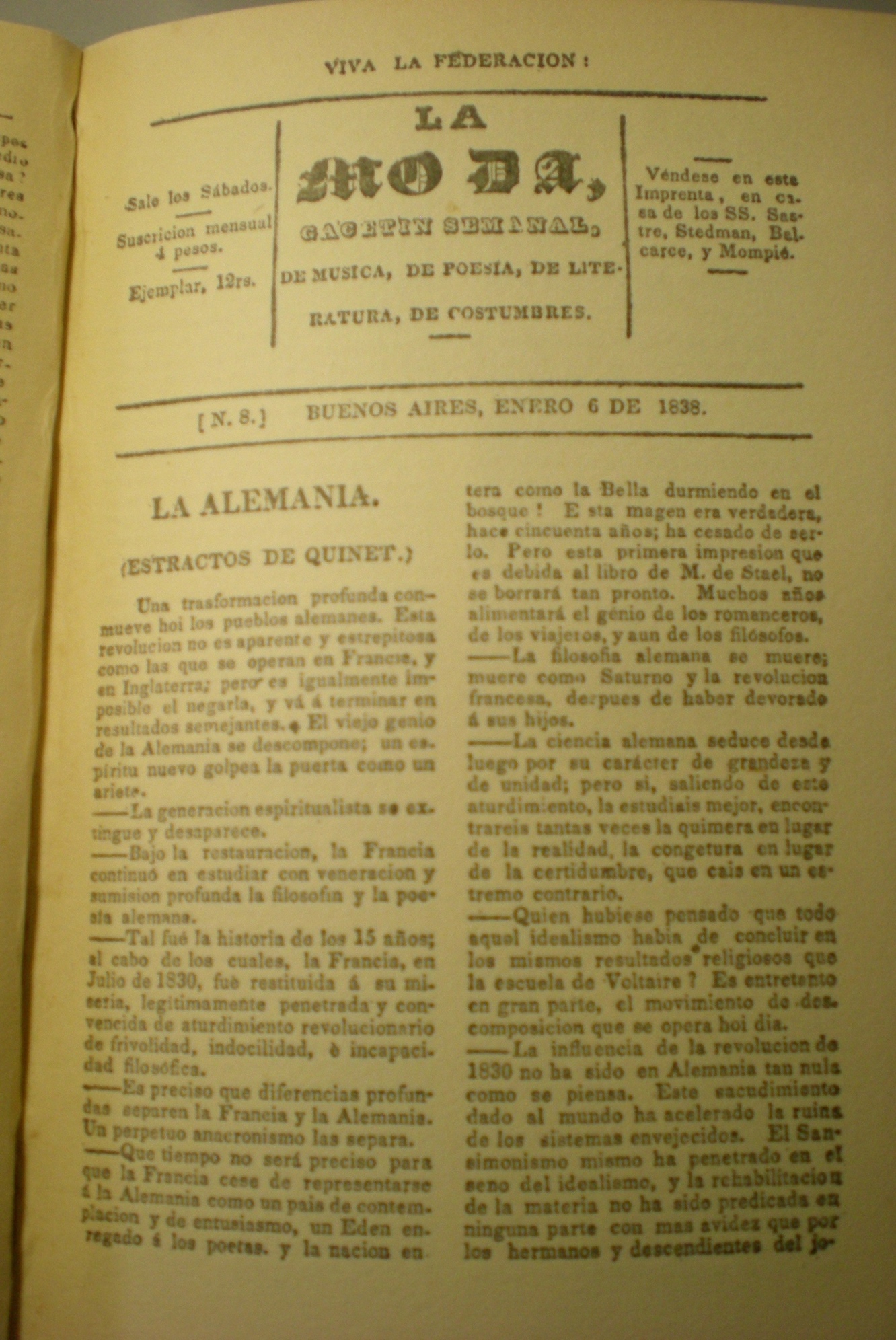 Su órgano de difusión propio fue la revista La Moda, que entre 1837 y 1838 editó 23 números, en cada una de cuyas portadas llevaba la leyenda “¡Viva la Federación!”, lo que antes que responder al contenido de sus páginas, constituía una suerte de venia formal al rosismo. Por otro lado, atendiendo al tono sarcástico de sus artículos, el lema ofrecía la posibilidad de ser leído con un dejo de burla al régimen. Varios de los miembros de la ´generación del 37´ se exiliaron en Montevideo y continuaron su labor en la revista El Iniciador entre 1838 y 1839.[8]