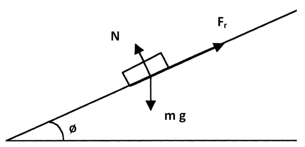 El bloque está sujeto a dos fuerzas: la fuerza gravitacional debida al peso (m g) y la de la fricción (Fr). La fuerza de fricción obedece a la siguiente relación: