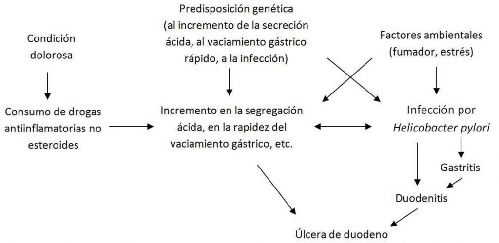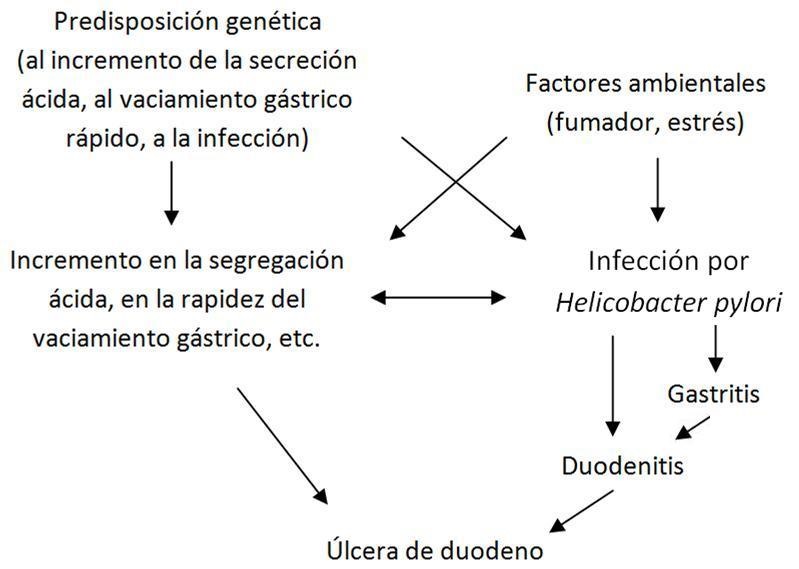 Pero el mecanismo es solo plausible. Es decir, aunque hay una correlación entre las úlceras de duodeno y la infección con H. pylori, no puede concluirse inmediatamente que una persona que padece úlceras tiene una infección: aproximadamente el 20 % de las úlceras son causadas por el uso de antiinflamatorios no esteroides, como la aspirina. El esquema completo sería el de la figura 9.2.