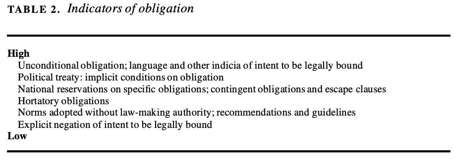 Selon Abbott, les règles juridiques et les engagements imposent un type particulier d’obligations contraignantes aux États et à d’autres sujets comme les organisations internationales[33]. Les obligations juridiques diffèrent des obligations résultant de la coercition, de la courtoisie ou de la moralité[34]. Les obligations juridiques mettent en application les normes, les procédures et les formes de discours établies du système juridique international[35]. L’auteur se fonde sur principe juridique international fondamental pacta sunt servanda signifie que les règles et les engagements contenus dans les accords internationaux légalisés sont considérés comme obligatoires, sous réserve de diverses défenses et exceptions, et ne doivent pas être considérés comme des changements de préférences[36]. Le tableau suivant énonce les indicateurs d’obligation suggérés par l’auteur.
