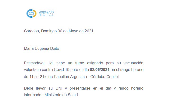 Figura 2. Turno para vacunación. Fuente: Correo electrónico personal de M. E. Boito (2021).