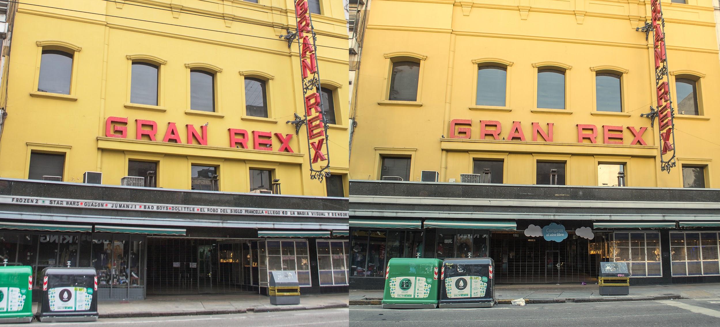 Fotos de la fachada de ingreso a la galería Rex (Figura 8). En enero de 2020, se puede leer la cartelera de los últimos filmes que fuimos a ver al cine. En enero de 2021, no hay anuncios, con más de 10 meses con las salas cerradas. Unos días después, cerró Cinerama.