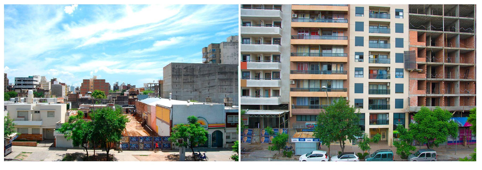 Las dos imágenes de la Figura 1 pertenecen al mismo lugar: boulevard San Juan al 500. Pero bien podrían pertenecer a otros puntos del centro de Córdoba, o a Nueva Córdoba, o incluso a General Paz, Alberdi o Alta Córdoba. Las separan 10 años: la primera fue tomada en 2005, la segunda en 2015. Logran retratar asombrosamente un momento de la historia cordobesa: el gris que va ganando espacio, el celeste que se pierde, los camiones cargando y descargando material de construcción, los gritos de los trabajadores que dan alguna indicación, el olor al asado de los viernes al mediodía.