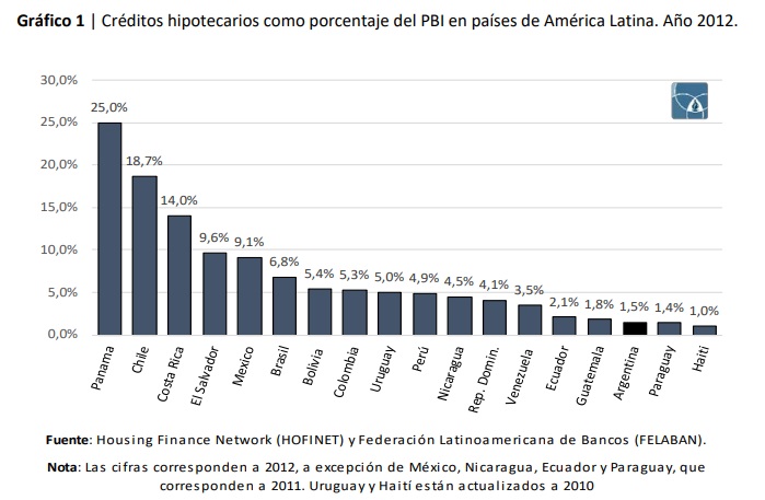 Un primer elemento a considerar para relativizar el peso del capital financiero en el desarrollo inmobiliario argentino es la bajísima participación del crédito hipotecario como mecanismo de financiamiento para la adquisición de viviendas en Argentina. Como se puede apreciar en la Figura 2, la importancia del crédito hipotecario es una de las más bajas de América Latina. Para el año 2012, su participación en el PBI fue del 1,5% para Argentina, superando solamente a Paraguay y Haití, y muy lejos de los valores observados en países como Panamá (25%) y Chile (18,7%). Si se la compara con lo que sucede en los países centrales, la divergencia es aún mayor. El porcentaje promedio en América Latina, que fue del 5,4% en 2009, contrasta fuertemente con el 61,4% verificado en los países centrales, entre los que se destacan algunos casos en los que dicha participación supera el 100%, como los Países Bajos o Dinamarca (Warnock y Warnock 2012).