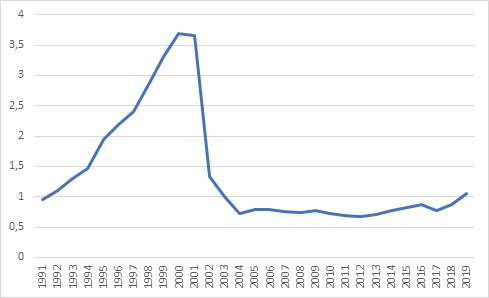 En este contexto general, Bonnet (2015) destaca que, con posterioridad a la crisis hiperinflacionaria de 1989, el capitalismo argentino inicia un proceso de reconstrucción, que implicó una serie de reformas profundas: la eliminación de una gran serie de regulaciones, las privatizaciones de empresas públicas y la liberalización del comercio internacional y el flujo de capitales, entre otras. Producto de esa reconstrucción se configura un nuevo modo de acumulación, cuyo objetivo central es la inserción en el mercado mundial a partir de la exportación de commodities de bajo valor agregado, fundamentalmente vinculados al sector agropecuario, y que tiene como actor protagónico al gran capital transnacionalizado. En este marco, la competitividad externa se erige como la variable central para garantizar el éxito de esa inserción (Bonnet, 2015). Este objetivo central decanta en una profunda restructuración productiva con orientación exportadora, que alcanzó tanto a la producción industrial como a la agropecuaria (Piva, 2015) y que se tradujo en un aumento del peso de las exportaciones en el total de la economía. Dicha participación aumentó del 7,6% en 1991 al 11,6% en 2001 y durante la posconvertibilidad alcanzó un promedio de 18,7%.