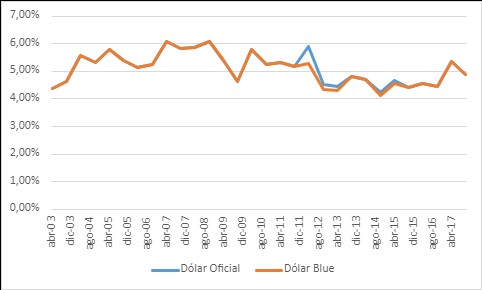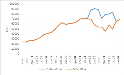 - En el año 2013, una encuesta realizada a inmobiliarias por las revistas Mercado y Reporte Inmobiliario indicó que el 4% de las operaciones se realizaban tomando como referencia el valor oficial del dólar, el 22% el dólar paralelo, el 34% un valor cercano al dólar blue y el 38% un valor intermedio (“‘Dólar ladrillo’: sólo 4% de las ventas en pesos se calculan al dólar oficial”, 15 de enero de 2013). ↵