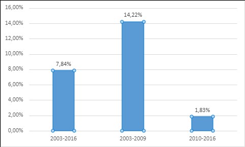 Como también se desprende del gráfico, esa valorización no se distribuyó de igual manera a lo largo del período. El precio creció permanentemente hasta 2011, para mantenerse relativamente estable desde entonces (considerando que el dólar de referencia se encontró entre el dólar oficial y el paralelo). Si hacemos un paralelismo con los períodos que identificábamos a la hora de analizar la distribución temporal de las construcciones en la posconvertibilidad (hasta 2009 y desde 2010), veremos que la desaceleración en la construcción estuvo acompañada por una reducción en el ritmo de valorización de las propiedades. Como observamos en la Figura 5, hay una clara diferencia en las tasas de crecimiento promedio anual del precio de los departamentos de un dormitorio entre ambos períodos: 14,22% entre 2003 y 2009, 1,83% entre 2010 y 2016.