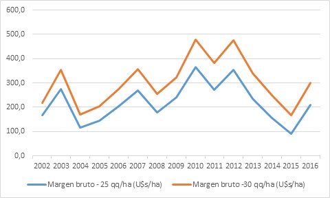 Figura 7. Margen Bruto en la producción de soja (2002-2016). Fuente: Elaboración propia en base a datos de Márgenes Agropecuarios.