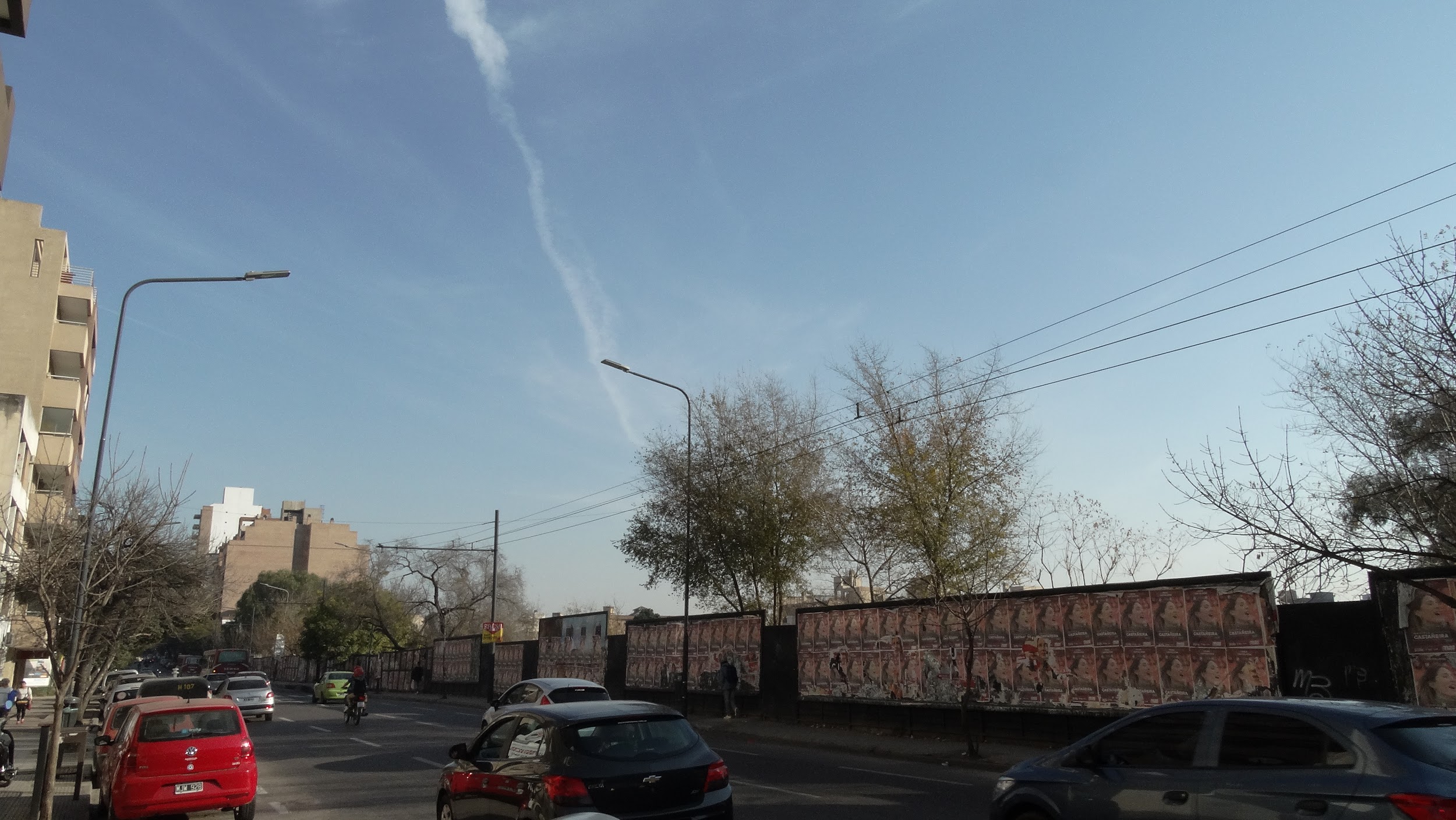 Meses más tarde, se encuentra una avenida Vélez Sarsfield despejada de naturaleza (Figura 7). Nada estorba al cielo desde la perspectiva de la cámara. No hay copas de árboles ni ramas largas que quieran alcanzarlo. Nada que salga, como en meses anteriores, del terreno de Pocito colma al cielo con su presencia. Se puede vislumbrar los árboles flacos y pelados sobre la vereda de la avenida. El resto ha sido talado. En el cielo celeste despejado se ve el tendido de cable y los postes del alumbrado público. En la cartelería que sirve como mural para tapar la propiedad privada se siguen pegando panfletos de propaganda política.