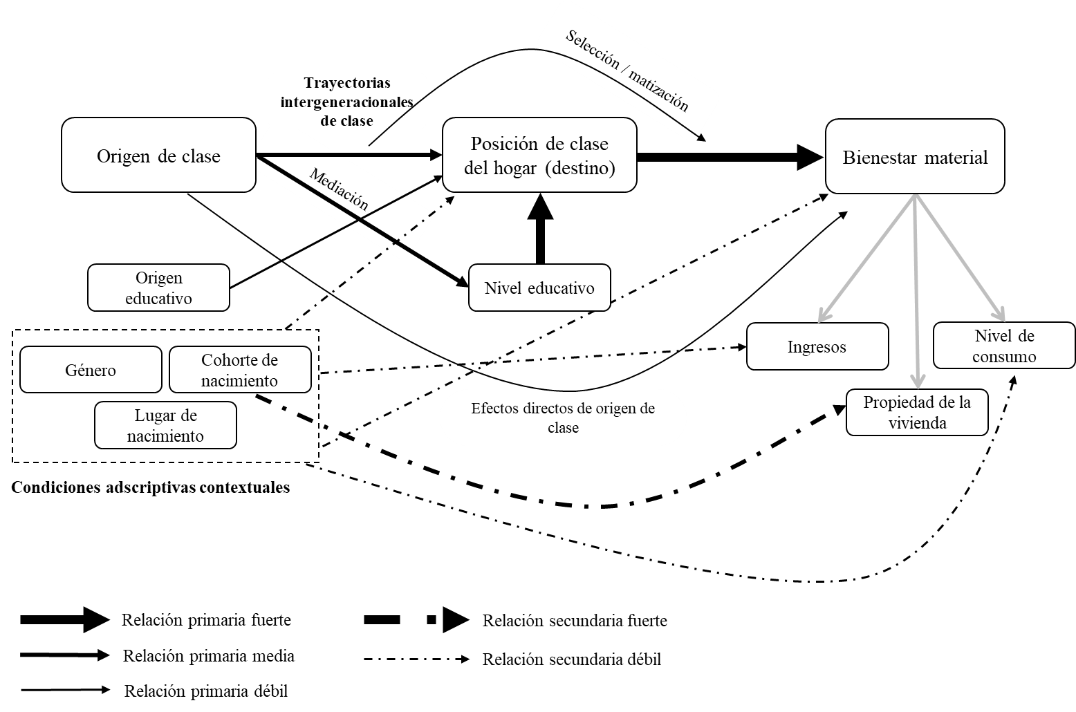 En este caso diferenciamos lo que podemos denominar relaciones primarias de las secundarias. Las primeras dan cuenta de las relaciones y mecanismos que en mayor medida nos hemos centrado en esta tesis, es decir, al vínculo entre el origen social, la posición de clase y el bienestar material. En cambio, las relaciones secundarias nos hablan específicamente de los efectos y condicionamientos que imponen las características adscriptivas-contextuales, que si bien fueron consideradas en esta tesis, su función fue la de controlar y especificar las relaciones primarias.