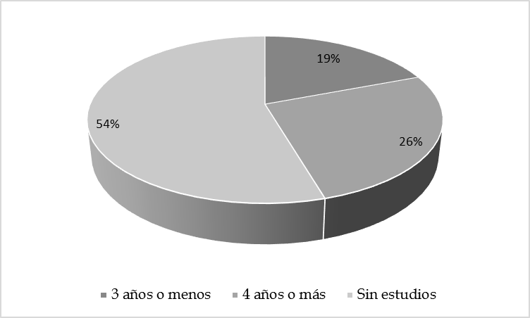 El gráfico 2 muestra que más de la mitad de las alumnas no posee estudios previos, el 26% tiene estudios de 4 años o más y solo el 19,57% posee estudios de 3 años o menos.