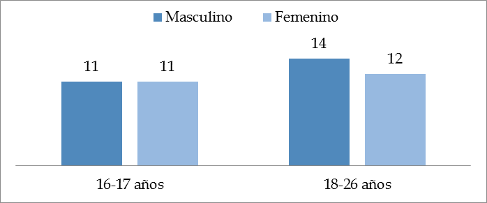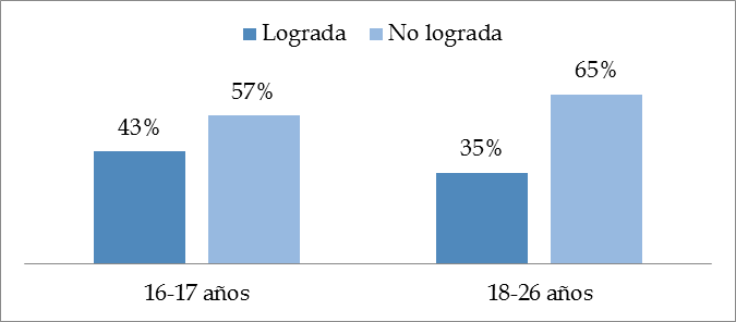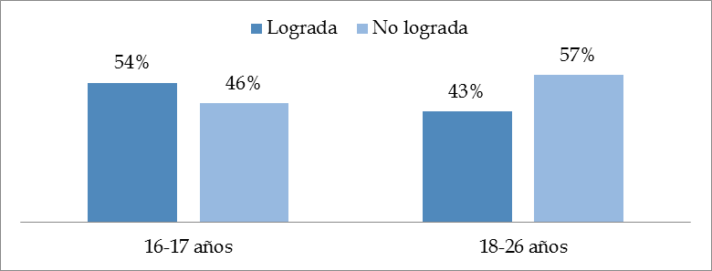Como se visualiza en el gráfico 16, la mayoría (54%) de los alumnos menores de edad, 16-17 años, lograron la inferencia. En cambio, los mayores entre 18 y 26 años, no la lograron en 57%. Según el cálculo X2, las variables lectura inferencial total y edad son dependientes, tienen relación entre sí.