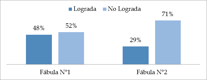 En ambas fábulas, es mayor el porcentaje de alumnos con inferencia no lograda, aunque en la primera la diferencia no es tan marcada como en la segunda. En la primera, el 52% no logró captar el sentido interno de la misma y, en la segunda, solo lo logró el 29%. El resultado de cálculo del X2 testifica que las variables lectura inferencial y fábula no tienen relación (gráfico 7).
