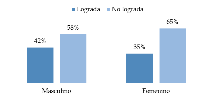 En relación con el sexo, el 58 % de los alumnos de sexo masculino no ha logrado captar la inferencia, tampoco el 65% de las de sexo femenino lo ha conseguido. El X2 indica que no existe relación entre las variables lectura inferencial en fábula y sexo, ya que son independientes (gráfico 8).
