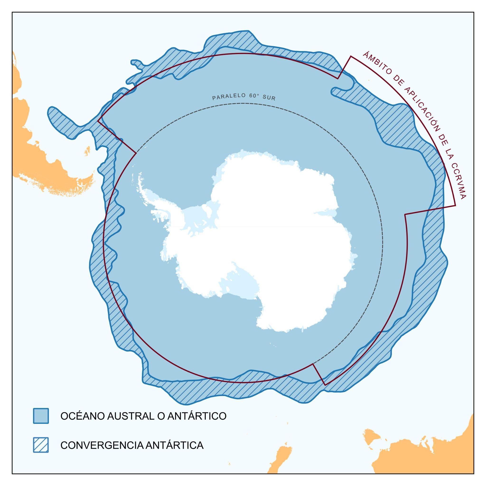 En su artículo VI, el Tratado Antártico estableció que su jurisdicción comprende toda la región terrestre e insular situada al sur de los 60° de latitud sur (Figura 1). De esta manera, quedan incluidas las barreras de hielo, pero no la de alta mar. Esta definición fue complementada por la CCFA, que sí incluyó el mar al sur de dicho paralelo, aunque sólo en lo referente a seis especies de mamíferos marinos (artículo I). A este sistema normativo desde 1980 se sumó la CCRVMA. Su ámbito de aplicación se extiende a todos los recursos vivos marinos antárticos desde las costas hasta la convergencia antártica. Sin embargo, para los fines prácticos, se simplificó su límite exterior con el trazado de una línea que se basa en la consideración de distintos paralelos y meridianos (artículo I).