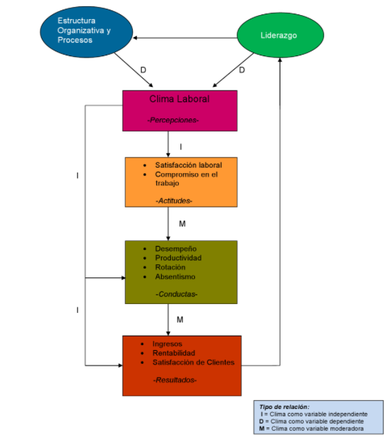 Más adelante en su obra, Bordas Martínez (2016) ofrece un esquema (ver figura 4) en el que pueden apreciarse las relaciones entre clima laboral y otros conceptos, como la satisfacción laboral y el liderazgo. Además, asocia tales conceptos de acuerdo con relaciones causales, que permiten interpretar variables independientes (I), dependientes (D) y moderadoras (M).