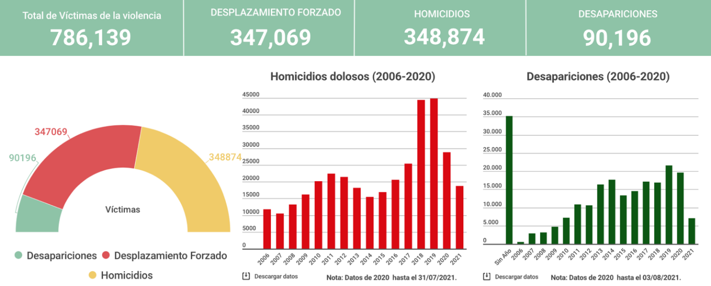 En el marco de esta estrategia ha sido la sociedad civil el sector más vulnerado y violentado en sus derechos humanos, pues en México, entre 2006 y 2021,[2] han sido asesinadas 348.879 personas (SESNSP, 2021);[3] 89.599 han sido desaparecidas (RNPDNO, 2021) y 347.69 son víctimas de desplazamientos forzados (CMDPDH, 2020).[4] (Ver Gráfico 1).