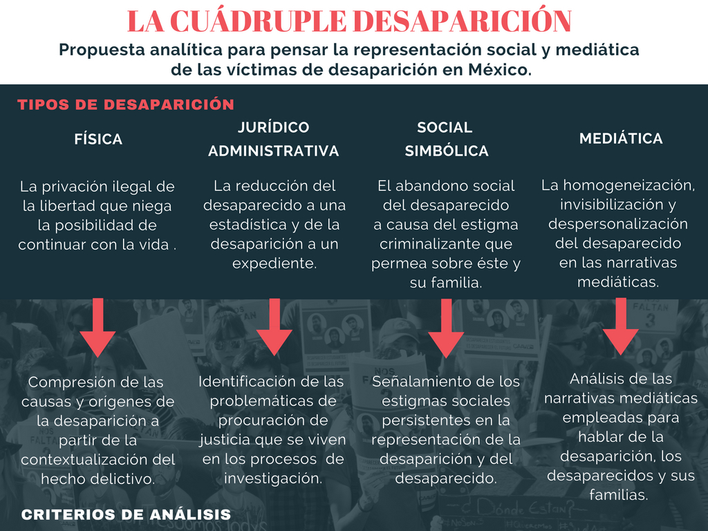 De ahí que se proponga el modelo analítico de la cuádruple desaparición como una apuesta teórico-metodológica para pensar las fases de desaparición que en México atraviesa no solo la víctima de este delito (el desaparecido y la desaparecida), sino también los familiares que le buscan y exigen al Estado búsqueda y justicia.