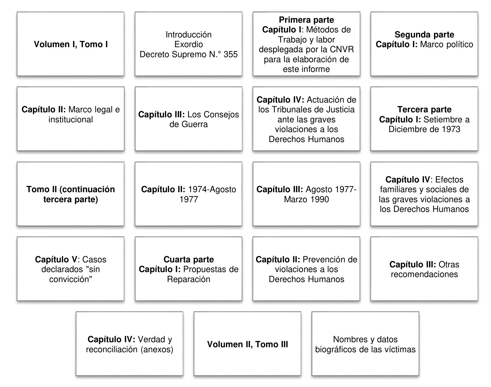 El informe se puede dividir en tres grandes momentos: el primero, del capítulo I al IV (primera y segunda parte), describe los antecedentes históricos y metodológicos de la dictadura, en la que se retratan linealmente los hechos ocurridos en el periodo de septiembre de 1973 a marzo de 1990; el segundo expone cronológicamente los hechos ocurridos en todo el período (capítulo I al V de la tercera parte); y, finalmente, el tercero, donde se recomiendan las medidas de reparación para todas las personas víctimas.