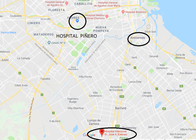 Mapa del sur de la CABA y conurbano bonaerense aledaño con las ubicaciones del Hospital Piñero, el Municipio de Lanús y el Hospital Esteves de la Provincia de Buenos Aires, Argentina, marcadas
