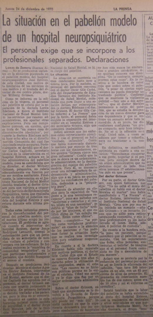 La Prensa (23 de diciembre de 1970). “La situación en el pabellón modelo de un hospital neuropsiquiátrico”.