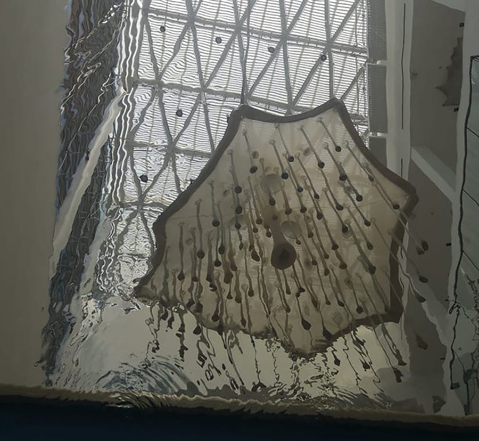 Imagen 1. Enquanto nada acontece, percibida desde el interior de otra instalación, La pileta de Leandro Erlich, sugiere que la flor o el hongo de la instalación de Neto podría ser también otro tipo de organismo: un agua viva. Fotografía de Irene Depetris Chauvin