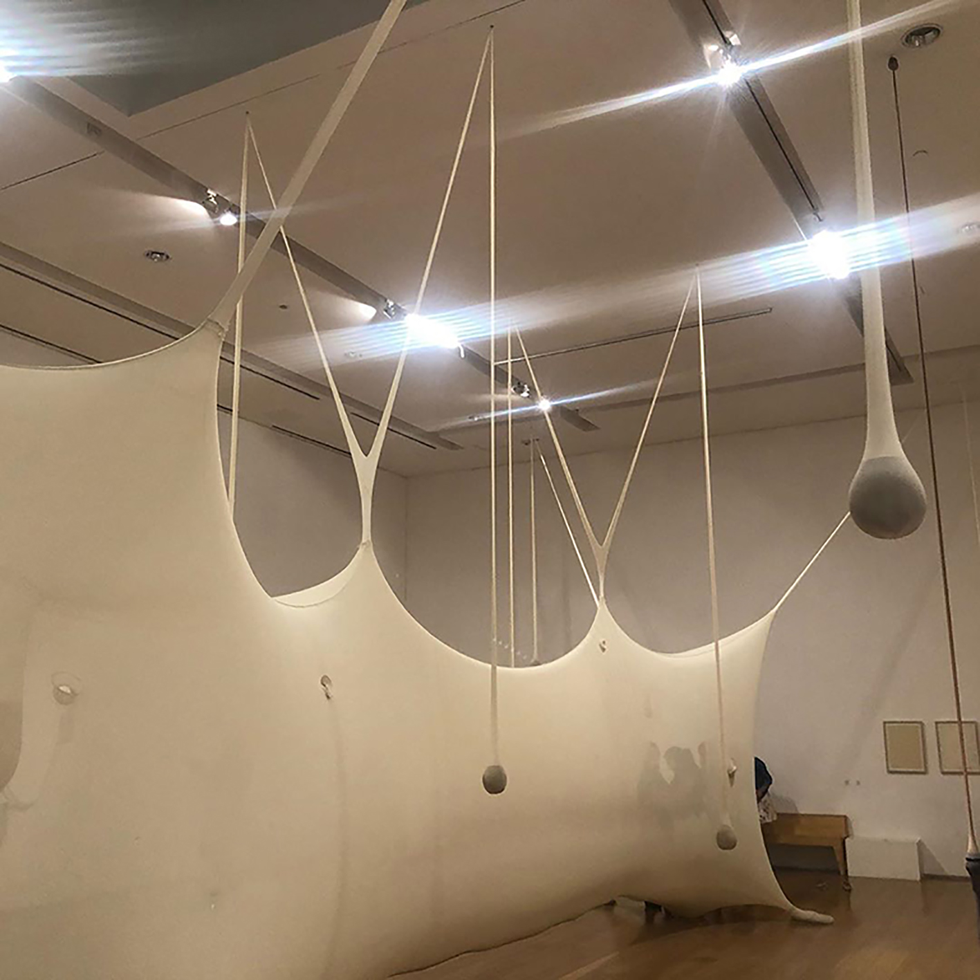 A través de los elementos pesados que estiran los textiles, algunas de las obras de Neto llegan a ser esculturas gigantes de tela de lycra o hilo, flexibles y elásticas, mutables, expansivas y disponibles para ser manipuladas y atravesadas por espectadores activos. Estas instalaciones inmersivas ponen en diálogo el espacio expositivo, el espacio de la obra y el cuerpo del visitante, activando sus sentidos. Pensando en los desarrollos en la lógica espacial de la modernidad, Peter Osborne caracteriza al espacio de arte como un tipo distintivo de “no lugar”; sin embargo, dentro del espacio del museo, las esculturas-instalaciones de Neto son más bien microespacios heterotópicos, unos “espacios otros” que simultáneamente representan, contestan e invierten otros espacios reales dentro de una cultura (Foucault, 2001, 30).