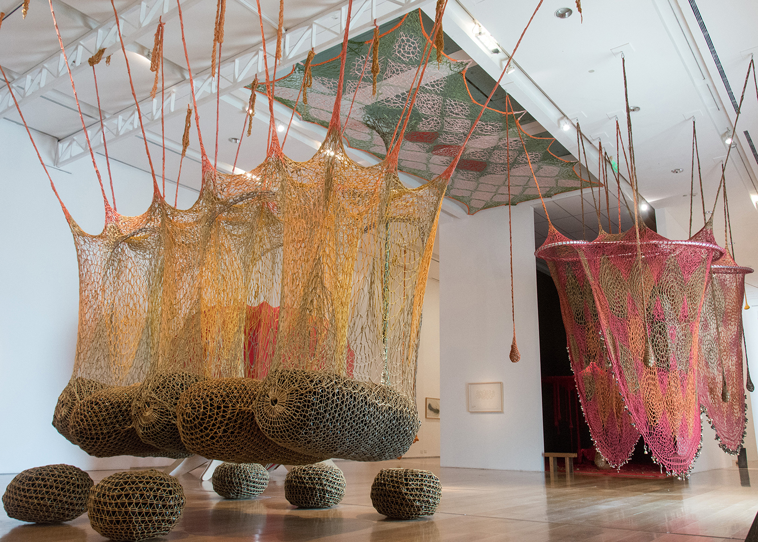 En la retrospectiva de Soplo, se destacan, por un lado, las obras que invocan los sentidos del observador y desafían su cuerpo a sumergirse en la escultura, y, por el otro, aquellas que solicitan una activación por parte del espectador y apuntan a una noción de cuerpo colectivo, al estimular, de forma lúdica, el contacto y la convivencia entre los participantes (metafóricamente el arte textil en sí mismo apunta en esa dirección ya que materialmente supone un trabajo de interrelación entre partes). Por último, otras instalaciones exploran espacios aptos para el ritual en un mundo contemporáneo que necesita nuevos modos de “curación”. En las tres instancias, es la performance háptica y afectiva de los distintos cuerpos, humanos y no humanos, la que impulsa a la detención, a pensar nuestro “estar en el mundo” e imaginar espacios otros.