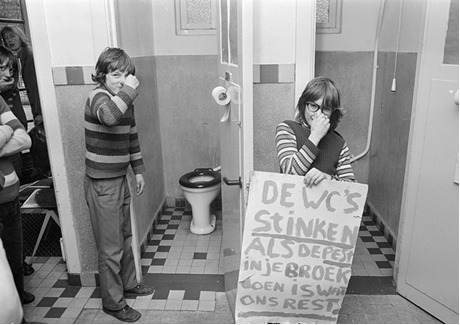 Rob Mierement (1947-2015), Alumnado del Christian Mavoschool en Monnickendam ocupan la escuela debido a edificios en mal estado [fotografía, 1973]. Localizada en La Haya, en la Nationaal Archief. Disponible en https://bit.ly/2FM6NvX.