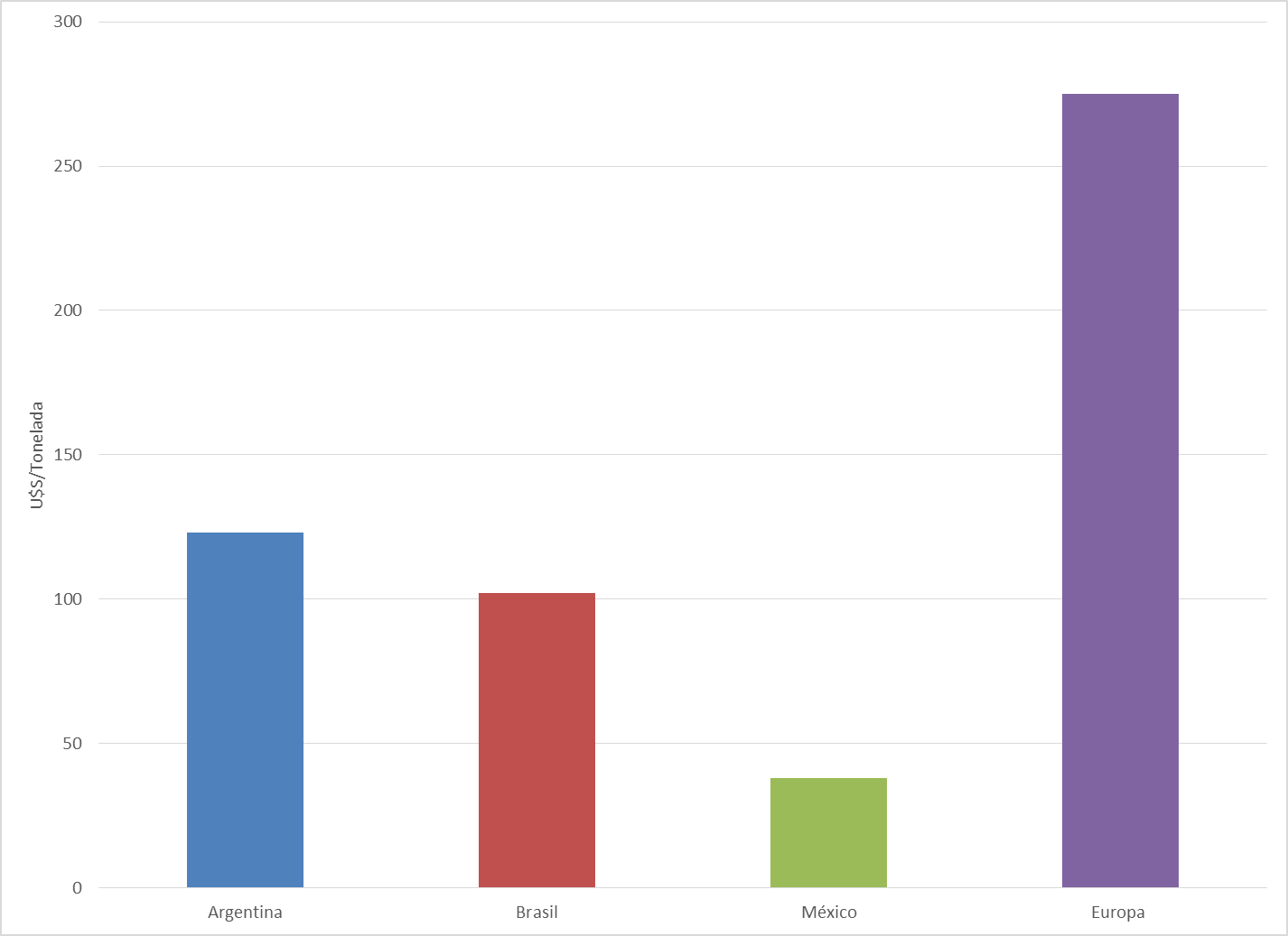 Gráfico 5: Costo de nafta petroquímica en Argentina, Brasil, México y Europa (dólares corrientes por tonelada), a marzo de 1980