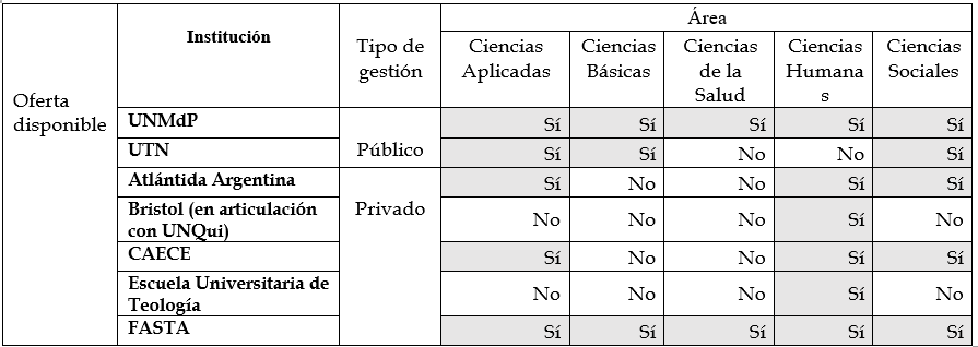 Para el nivel superior, la oferta se concentra en la ciudad de Mar del Plata. Como señala Mollis “no obstante la gran expansión y el crecimiento de la cobertura de la educación superior en Argentina en las últimas décadas, su distribución y características distan de ser homogéneas en las distintas provincias y regiones.” (2008: 515). De hecho, en el cinturón no existe oferta de nivel superior (ni en educación terciaria ni universitaria), por eso, la ciudad de Mar del Plata actúa como receptora de los jóvenes que quieren continuar sus estudios.