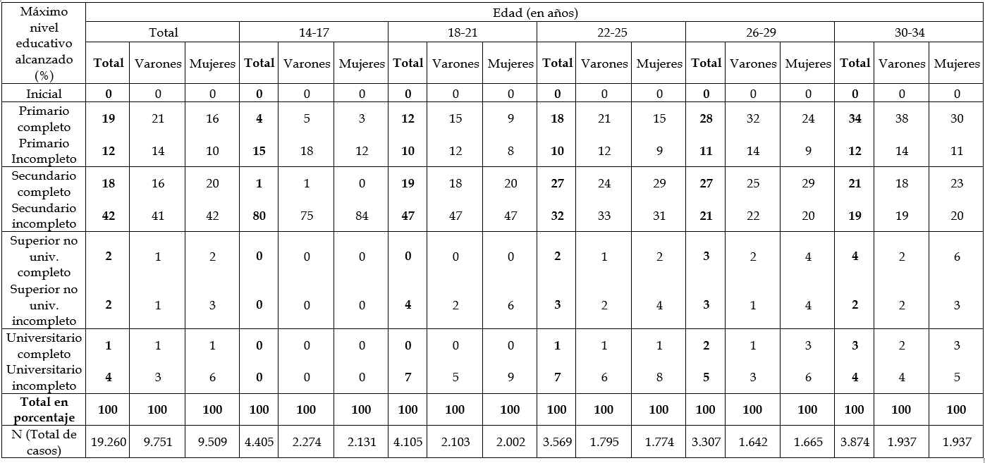Las mujeres poseen mejores niveles educativos, superando en diez puntos porcentuales para cada categoría a los varones. En los hogares, se suele priorizar que ellas continúen sus estudios y los hombres realicen actividades laborales, lo que podría estar explicando estas diferencias, pero, si bien obtienen mejor rendimiento académico, luego, esto no se traduce en mejores oportunidades para ellas (Acker, 1995).