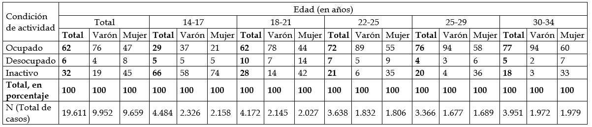 De hecho, a partir de esa edad la inactividad se reduce profundamente y se duplica la desocupación, ya que muchos jóvenes comienzan a buscar un empleo. Así a medida que se avanza en la edad que los jóvenes comienzan a ocuparse, llegando a los 34 años con más del 75% de la población ocupada.Al distinguir por género, los varones suelen representar mayores porcentajes de ocupación en cada segmento de edad. La inactividad de las mujeres puede estar explicada por la inserción en tareas del hogar (cuidado de otros miembros, limpieza, entre otras) que no son consideradas como trabajo. Las expectativas de una mejora de la situación económica se podrían reflejar en la búsqueda de trabajo y podrían estar explicando los valores de la desocupación (Bocero y Di Bona, 2014).