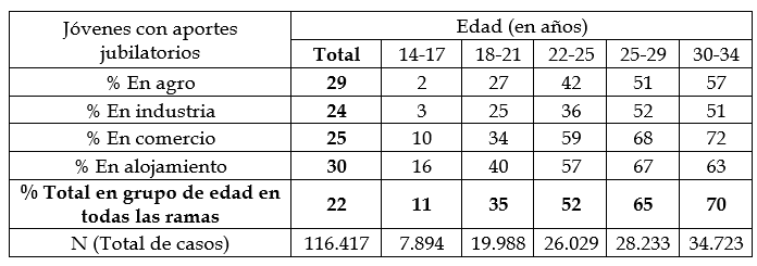 En el Cuadro 2 se puede evidenciar los niveles de formalidad en el trabajo, a partir de los jóvenes que cuentan con aportes jubilatorios. La situación varía a lo largo de la edad: los adolescentes cuentan con escasos aportes, al igual que parecieran ser las primeras inserciones laborales después de los 18. Sin embargo, en los últimos rangos de edad supera el 60%.