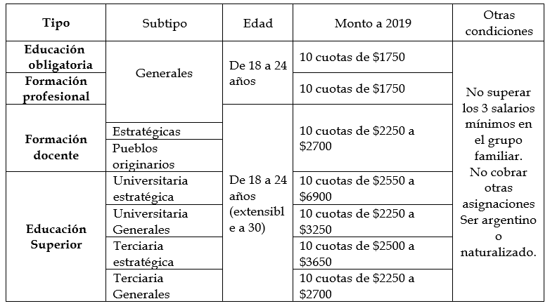 Del mismo modo, el Estado Nacional para el nivel secundario otorga becas de perfeccionamiento en temas considerados estratégicos para secundarios técnicos (Becas Puro Código) (Argentina – Ministerio de Educación, 2019c) y de apoyo a la escolaridad a ciertos grupos delimitados (estudiantes de pueblos originarios, apadrinados por el Poder Ejecutivo Nacional, hijos de veteranos de guerra de Malvinas, en Protección de derechos).