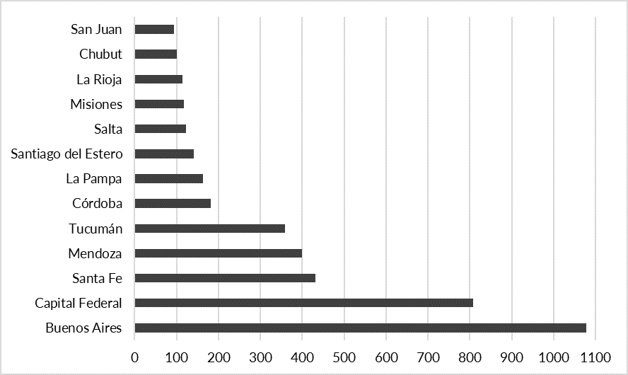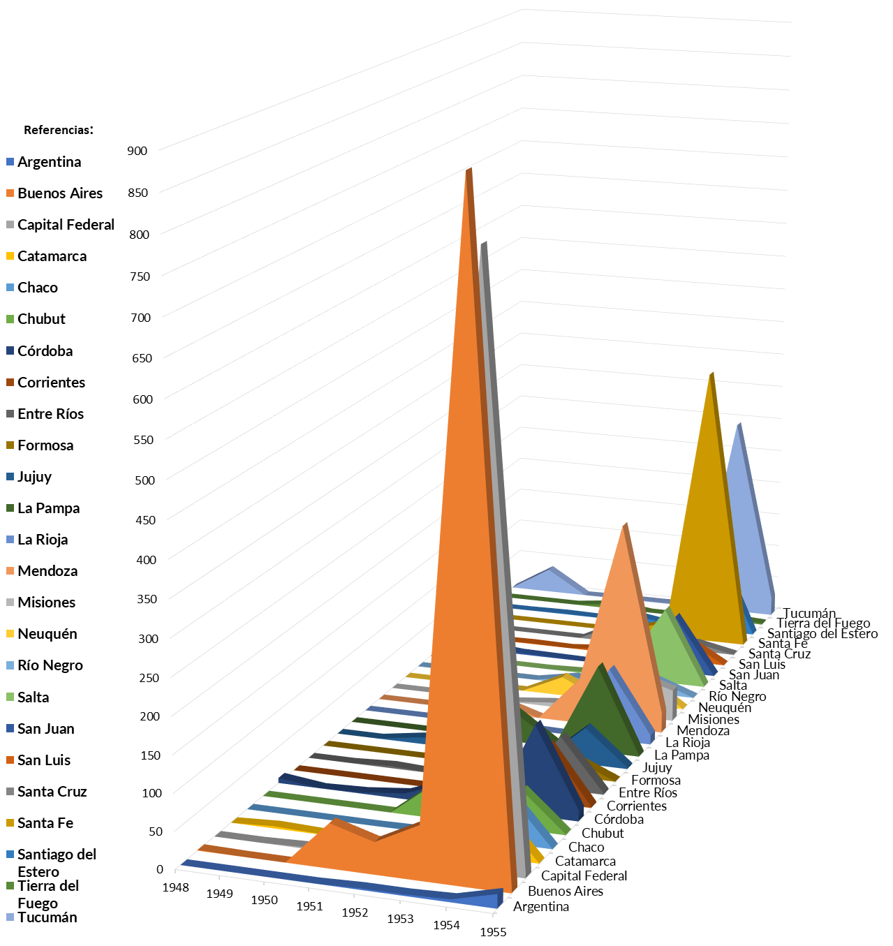 Como puede apreciarse en el gráfico 1 y 2, si 1953 fue “el año de la organización” en el calendario peronista, 1954 bien puede haber sido el año del castigo. Pero puede advertirse, con más claridad tal vez en el gráfico 3, que fueron Buenos Aires, Capital Federal, Mendoza y Tucumán, los territorios que –entre 1953 y 1954– expulsaron mayor cantidad de afiliados. La diferencia entre Buenos Aires y Capital Federal y el resto del país es notoria. De poco más de 3900 expulsados en 1954, Buenos Aires y Capital Federal tuvieron 905 y 762 respectivamente.