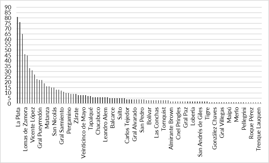 Aumentemos la graduación de la lente para continuar la reflexión. Consideremos las expulsiones colectivas en la provincia de Buenos Aires (la gran mayoría de las expulsiones se realizó a través de resoluciones con listas de castigados). Como muestra el gráfico 4, también podríamos sugerir que hubo distritos más comprometidos que otros (La Plata, Lomas de Zamora, Vicente López, General Pueyrredón, Matanza). Eso puede haberse debido a una ecuación que cruzara faccionalismo y número de afiliados, pero incluso así, lo que se desprende es que expulsar se había convertido en una actividad practicada en La Plata y en Roque Pérez también, en la más grande y en las más pequeñas poblaciones. Expulsar era una práctica política de las autoridades partidarias.