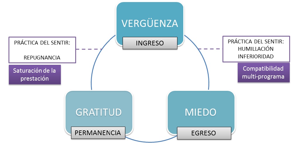 En las narraciones de las personas entrevistadas, independientemente de la generación a la que pertenecen, aparece con fuerza la vergüenza asociada al ingreso, el agradecimiento a las ayudas durante la permanencia y, el miedo vinculado a la finalización o pérdida del programa. Las emociones, en tanto prácticas, impulsan la acción. Es decir, las conexiones entre las percepciones, las sensaciones y las emociones operan en un estado pre-reflexivo que se vuelven acciones concretas. Por ejemplo, la vergüenza a realizar los trámites de ingreso puede paralizar la acción, postergarla, etc. El miedo, asociado al hambre como violencia de la coacción externa, entra en tensión con la vergüenza. El avance de los límites de la vergüenza implica la reducción de miedo, porque el miedo, es miedo a no tener para comer. De esta manera, a los programas se ingresa con vergüenza, como una práctica del sentir inferioridad a partir de la focalización negativa de los diseños. En la tensión entre la vergüenza del ingreso y el miedo a perder el programa se despliegan acciones a partir de esas emociones, como por ejemplo, la compatibilidad multi-programa que requiere del capital social y cultural (sensu Bourdieu) que garantiza las herramientas para encastrar el rompecabezas de las múltiples intervenciones.