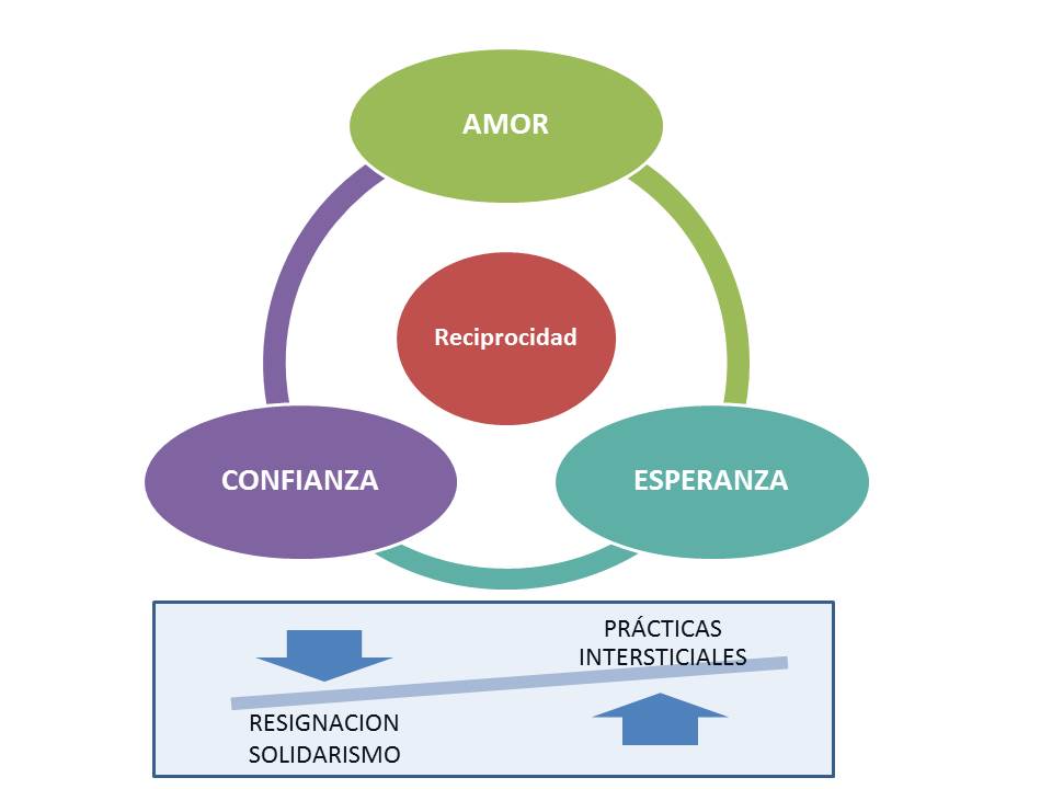 La esperanza, aunque tensionada con el miedo, motoriza la acción; en tanto implica el deseo y la expectativa de que una posibilidad deseada se haga real (Ahmed, 2019). La confianza implica “creer en la otra mujer” y enlazar el vínculo de dar-recibir-dar desde el que se rompe con la religión neo-colonial, porque la credibilidad destituye a la frustración como mecanismo de coordinación social. En este contexto, desplazarse en la organización cotidiana de la vida con prácticas de reciprocidad al interior de la comunidad barrial diluye al solidarismo. Finalmente, el amor teje las interacciones de la reciprocidad en tanto, amar al otro es alimentarse con él (Le Breton, 2007); amar es desear la autonomía del otro (Scribano, 2020) y para ello, potenciar la acción, comprendiendo las infortunios y las pasiones tristes, para disputar, en los límites de las posibilidades, la distribución de las energías.
