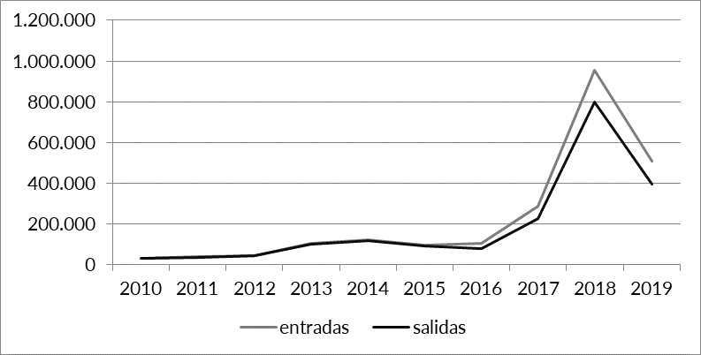 Gráfico 1. Entradas y salidas de venezolanos al Ecuador (2010-2019)