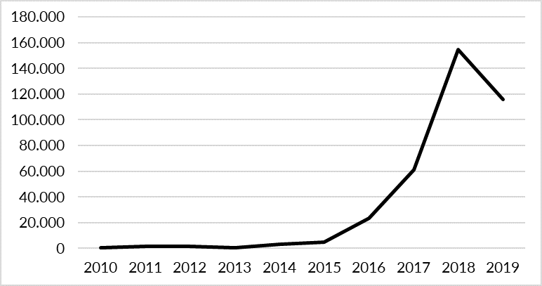 Gráfico 2. Saldo migratorio de venezolanos en el Ecuador (2010-2019)