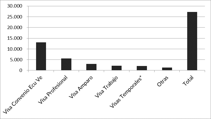 Miles de venezolanos optaron por esta vía para obtener su estatus legal. Desde febrero de 2017, cuando el gobierno ecuatoriano empezó a otorgarla, hasta diciembre de 2019 se entregaron 84.350 visas Unasur. Las visas Convenio dejan de ser utilizadas por los venezolanos desde que entró en vigencia la nueva ley y con ella la categoría de ciudadanía suramericana. Se observa claramente que la estrategia de residencia de los venezolanos en el Ecuador cambió al dejar de solicitar la “visa convenio”, utilizada hasta 2016, y optar por la “visa Unasur”. Vale resaltar también la disminución de la visa profesional, lo cual confirma el cambio de perfil de los últimos venezolanos en arribar al país y la dificultad por obtener ciertos documentos apostillados como el título profesional.