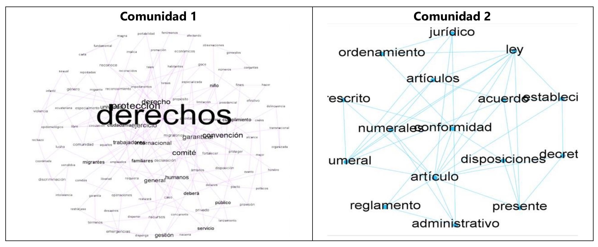 En complemento con dicha mirada, se realizó un análisis de redes del conjunto de normas, leyes y decretos sobre migración emitidos en los tres países en el período que va de 2015 a 2020. Una vez que se tiene una base de datos textual, se utiliza la conectividad de las palabras a partir de la secuencialidad que tienen estas en los documentos. En otros términos, este análisis nos permitió identificar algunas de las palabras más importantes en el conjunto de documentos que sirvieron de base para el análisis de las principales decisiones en materia migratoria. Para ello se diseñó un algoritmo heurístico conocido como “Tabú”. A partir del resultado obtenido por este algoritmo, se garantiza que la red contenga las entidades (en este caso las palabras), que dan sentido a los documentos utilizados por la investigación. El producto final, luego de este análisis de redes, son las comunidades, que nos ayudaron a ubicar y graficar los términos relevantes en la lectura detallada del corpus normativo que constituye nuestra fuente de información[2].