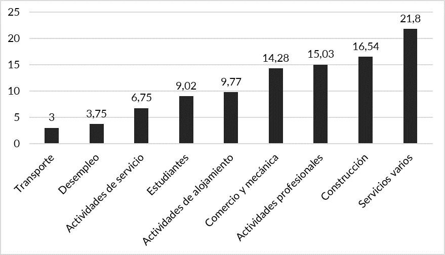 También vale resaltar aquellos vinculados al comercio (14 %), principalmente en el sector informal y venta de todo tipo de productos, y otros atendiendo en hoteles y salones de comida (10 %), ya sea en la recepción o como meseros; un 9 % respondió estar estudiando, aunque varios de ellos señalaron que estudian y trabajan.
